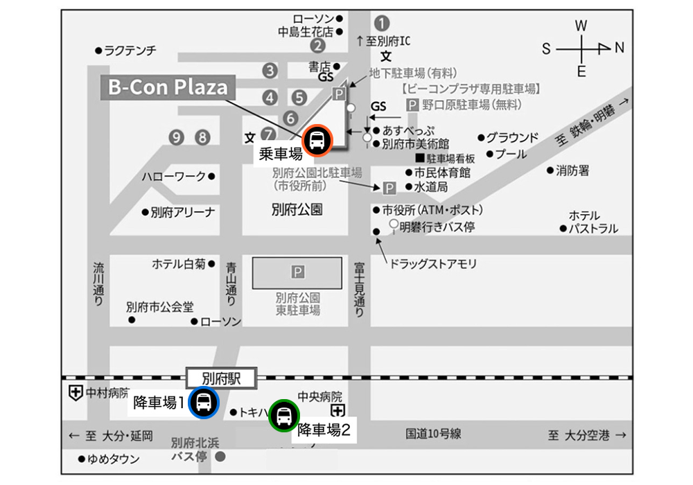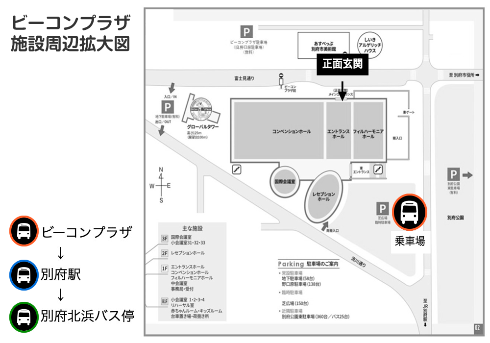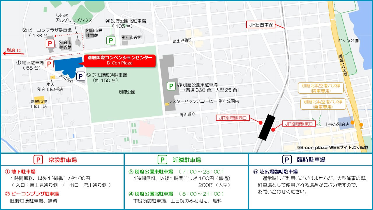 お車でお越しの際にビーコンプラザ会場の地下駐車場が満車の場合は、会場周辺の駐車場(別府公園東駐車場、別府駅周辺の駐車場など)をご利用ください。