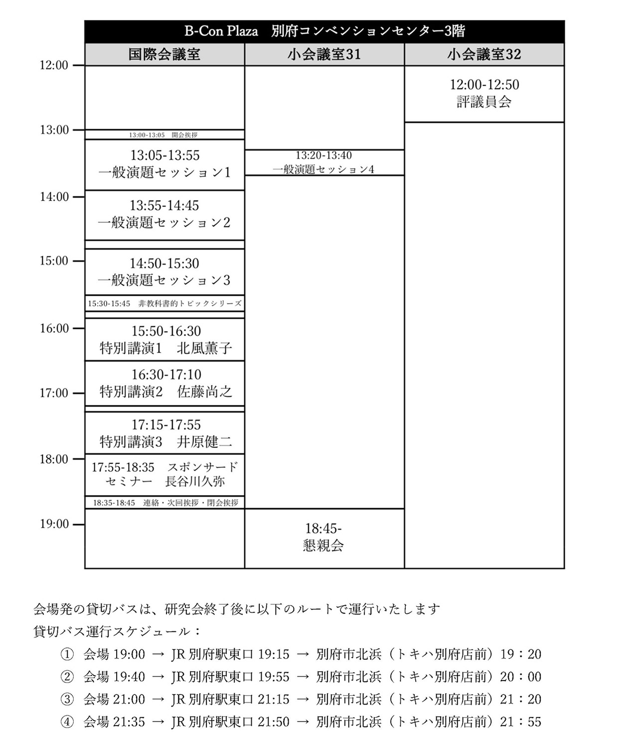 バス運行のご案内 研究会終了後(19:00発、19:40発)と懇親会終了後(21:00発、21:35発)に無料送迎バスを運行いたします。各2回の運行となりますので乗り遅れにご注意ください。